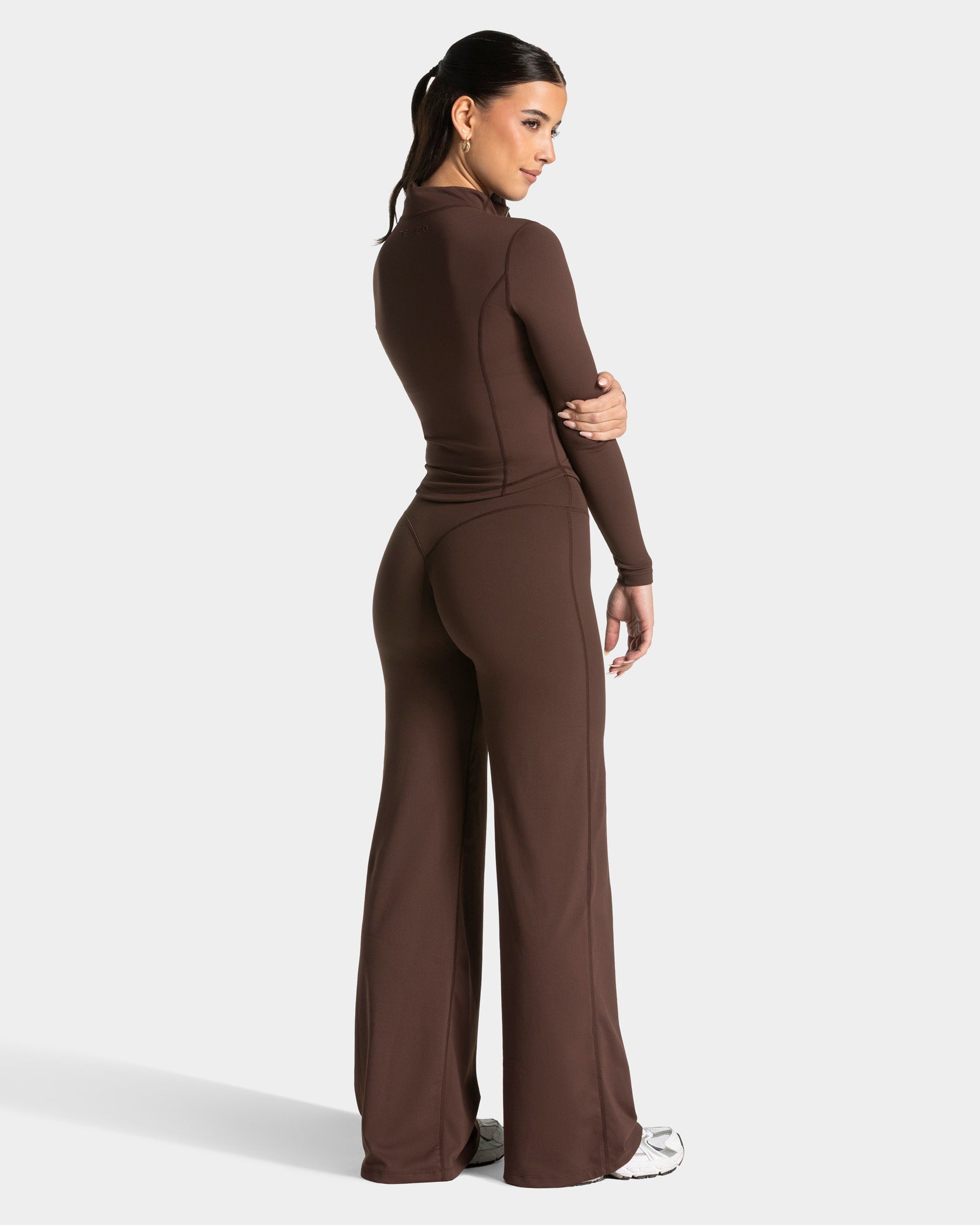 Beim Training wie im Alltag: Unsere Allrounder Shaping Zip Jacke in Espresso - Gold betont dank der Prinzessnaht deine Figur und ermöglicht dir, durch den superweichen und atmungsaktiven Stoff das Beste aus dir herauszuholen. Die Jacke hat außerdem einen wunderschönen, hochgeschlossenen Kragen. Der durchgehende goldene Front-Reißverschluss und die Seitentaschen bieten dir Flexibilität, während die Jacke durch das glänzende TEVEO-Logo auf der Rückseite abgerundet wird