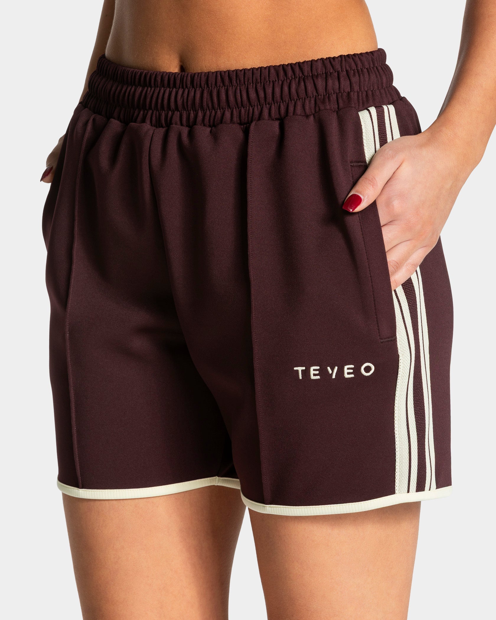 Die Club Shorts in Merlot kombiniert markante Kontrast-Streifen mit einer präzisen Biese – ein Look mit Wiedererkennungswert. Der mittellange Schnitt mit dem Kontrastpiping am Saumabschluss bringt dabei die perfekte Balance aus Sportlichkeit und Style. Ein elastischer Bund mit Kordelzug sorgt für individuelle Passform, Reißverschlusstaschen mit Staydown Puller sichern deine Essentials. Das gestickte TEVEO Kontrast-Logo und eine angedeutete Leistentasche vervollständigen den Look. Für alle, die ihren eigenen Standard setzen.