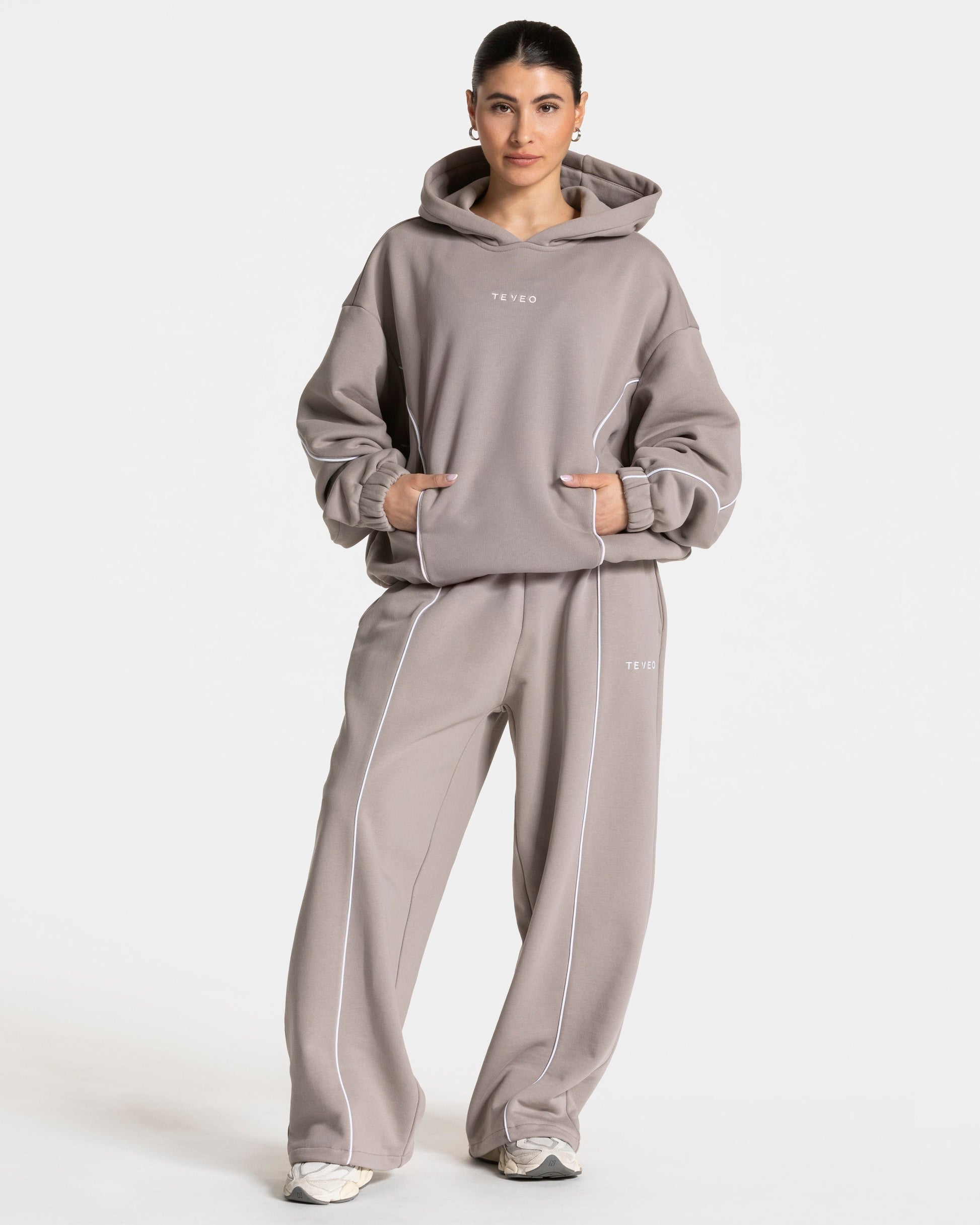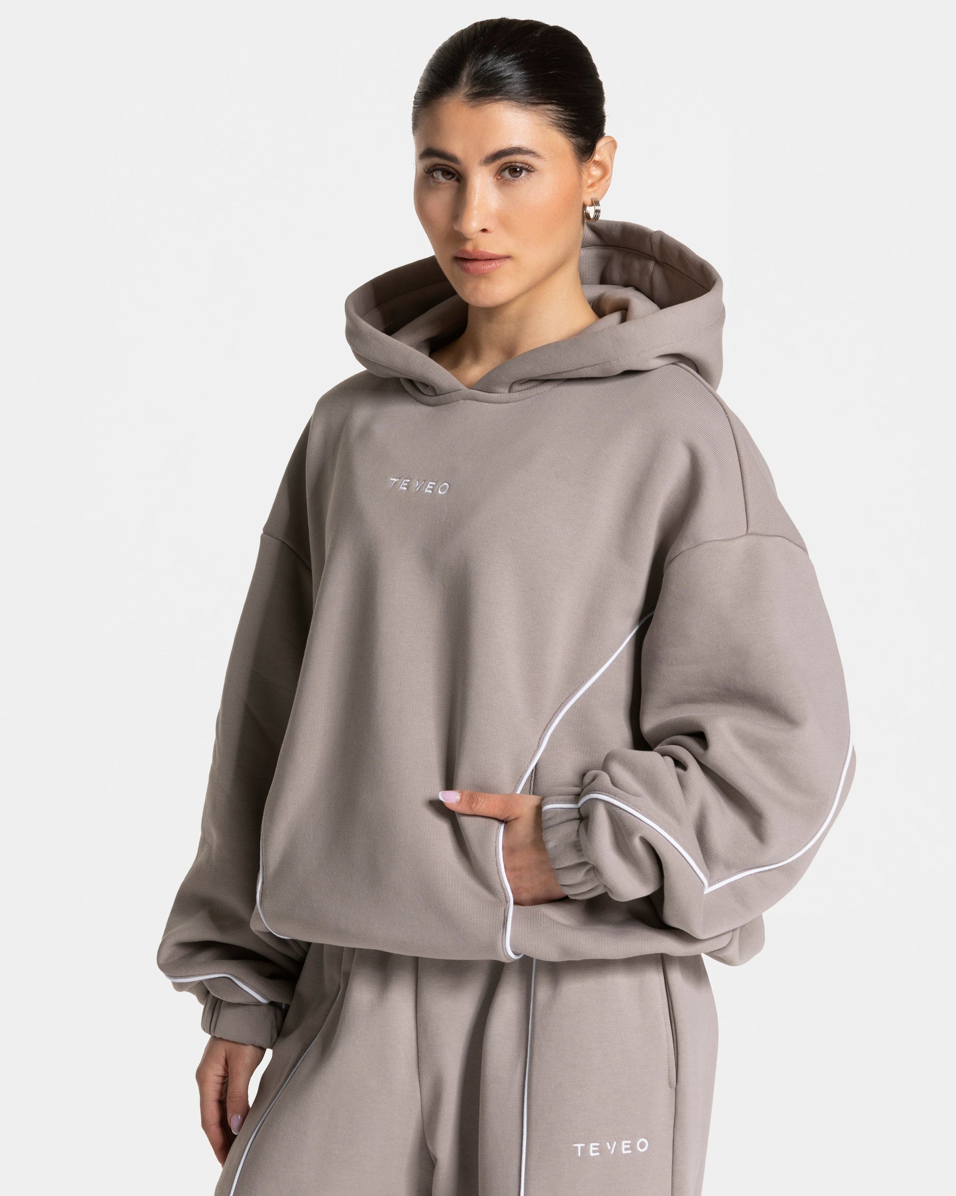 Der Contrastline Hooded Sweater in Stone vereint Komfort, Style und Funktionalität in einem modernen Design. Der Sweater überzeugt sowohl mit den markanten weißen Kontrastnähten als auch den versteckten Taschen. Mit seinem Oversized Fit und integriertem Gummizug zum Croppen sowie der festen Kapuze ist er dein perfekter Begleiter für kühle Tage, dein Warm-up oder zum Wohlfühlen.