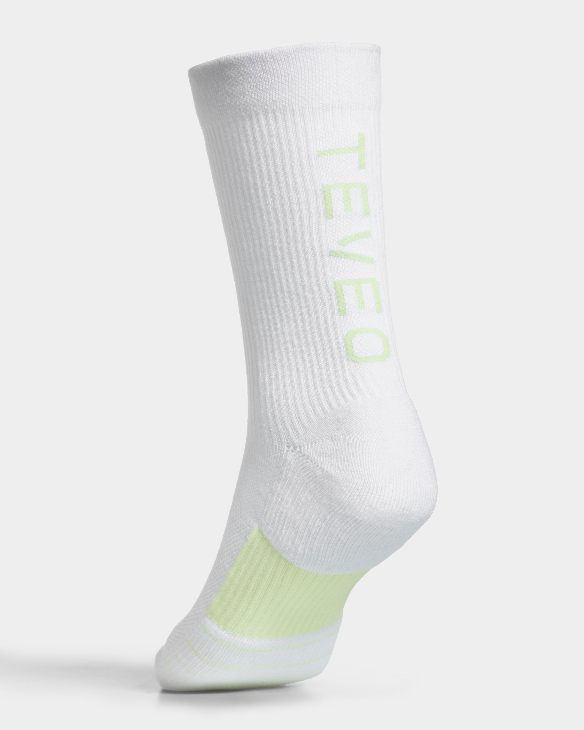 Die END Running Socken in Weiß-Limelight bringen nicht nur Style, sondern auch Performance auf die Strecke. Der hohe Schnitt sorgt für einen sicheren Halt, während die gerippte, atmungsaktive Struktur am Fußrücken dir ein angenehmes Tragegefühl verleiht. Die Verstärkung am Spann sowie die gepolsterten Fersen und Zehen bieten dir optimalen Support – Kilometer für Kilometer. Das vertikal verlaufende TEVEO-Logo setzt ein starkes Statement und macht die Socken zum Must-Have deiner Running-Gear.