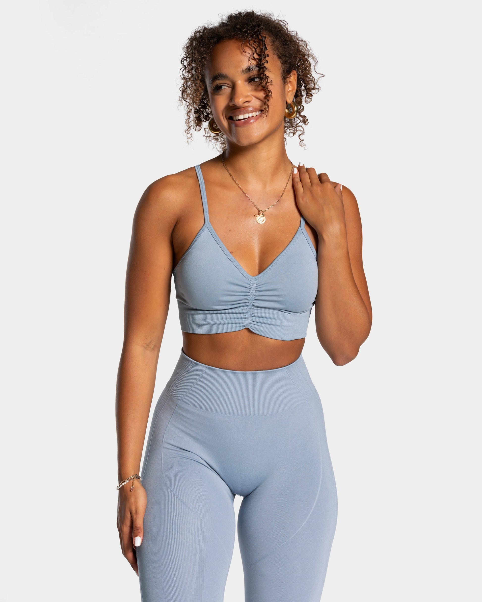 Der Focus Bh in Stahlblau mit herausnehmbaren Pads ist das perfekte Gegenstück zur Focus Leggings. Dieser gibt dir durch den Bund einen hervorragenden Support. Der Focus Bh in Stahlblau setzt dein Dekolleté besonders durch den V-Ausschnitt sowie den Scrunch vorne in Szene.