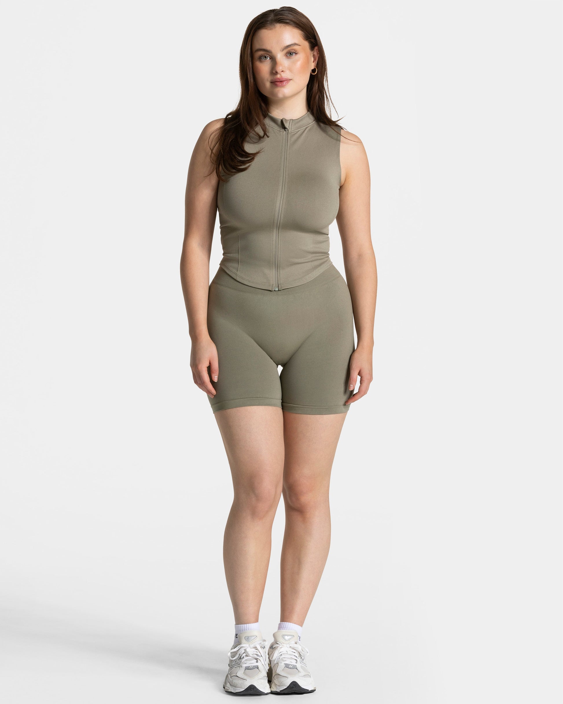Inspiriert von der Femme Shaping Zip Jacke, kombiniert das Timeless Pro Zip Tank in Khaki den Look einer Shaping Zip Weste und figurbetonter Passform. Der Stehkragen sorgt für die Eleganz und die seitliche Rippstruktur für optimalen Shape und Halt. Der Zip Tank bietet dank des durchgehenden Zippers Flexibilität für eine sportliche, cleane Ästhetik oder einen entspannten Add On.